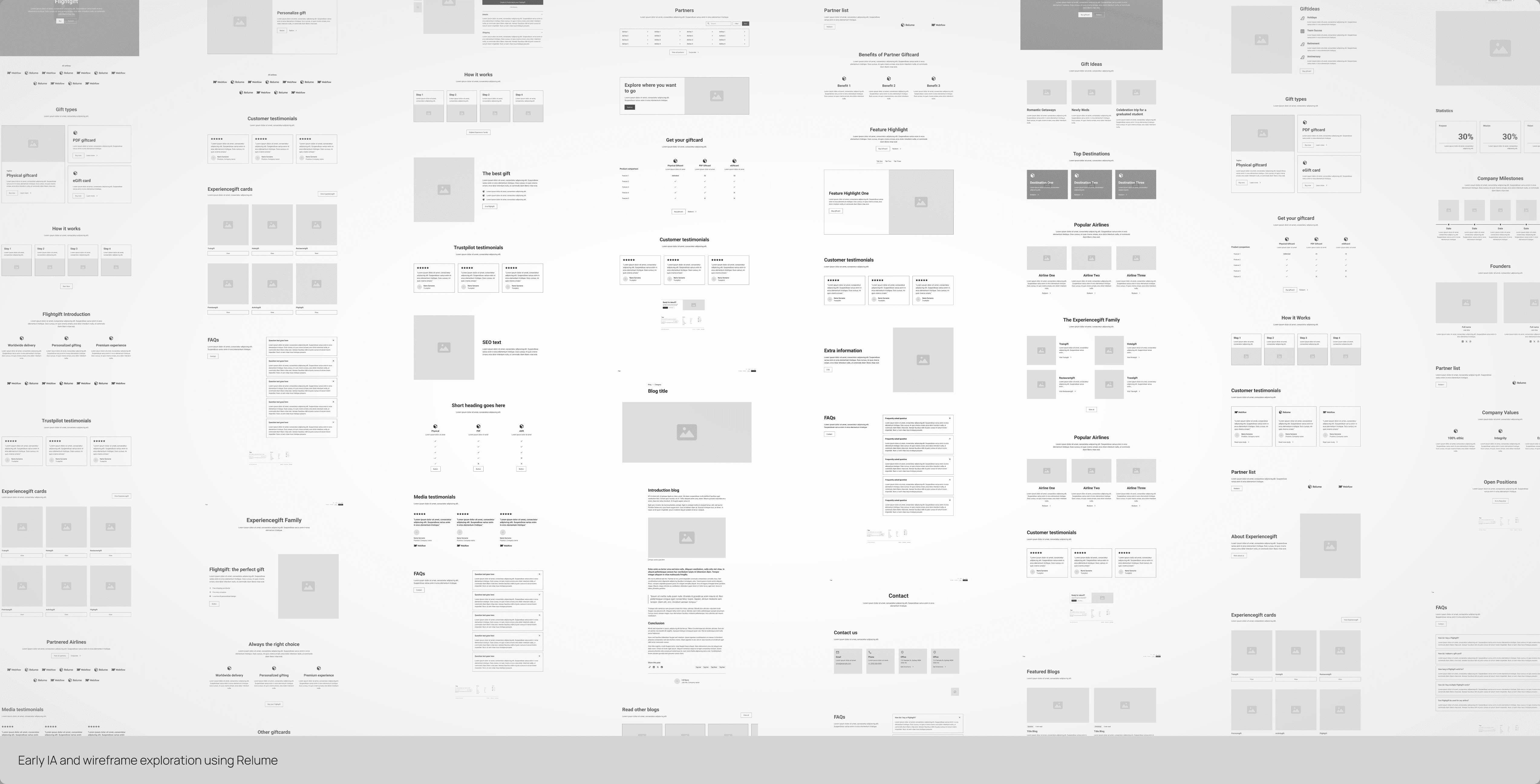To define the information architecture across brands, we first mapped all existing content and identified what to keep, update, or add for SEO and clarity. Using Relume, we generated fast low-fidelity wireframes to explore layout options and validate structure before moving forward.