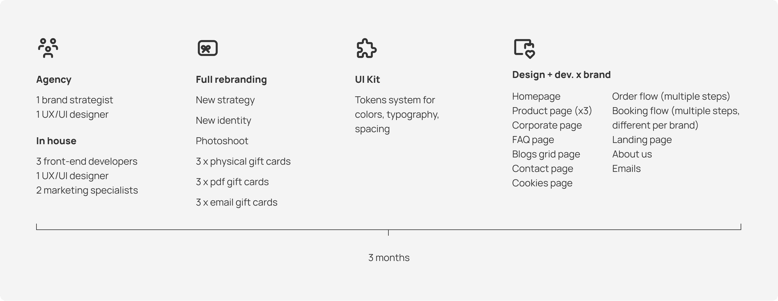 We followed a lean, accelerated process shaped by the tight timeline, existing business insights, and the need to bring a new premium identity to many brands simultaneously.