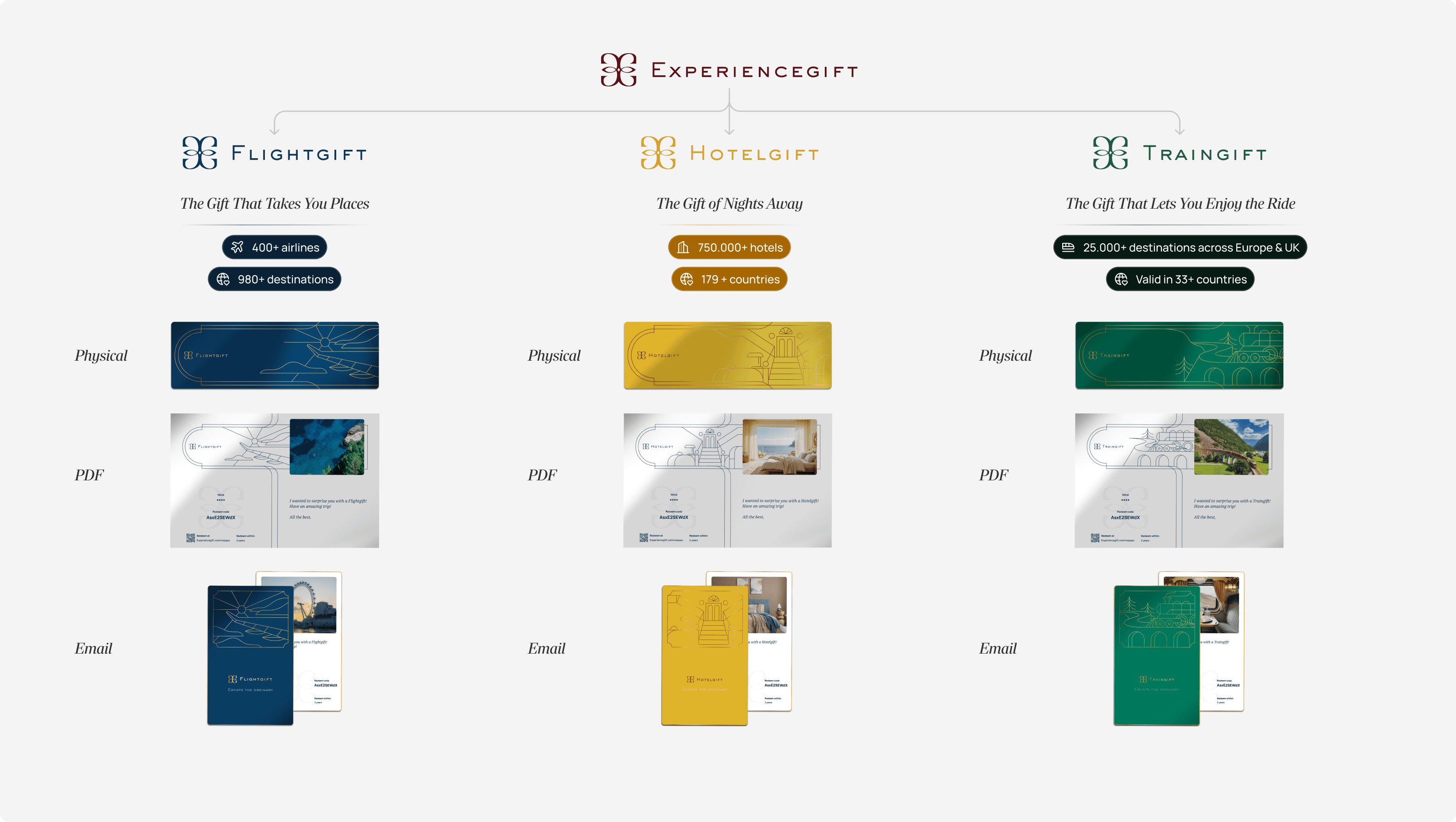 Experiencegift is a global gifting company offering premium gift cards for flights, hotels and trains. After years of rapid growth, the company decided to fully rebrand the parent brand and three sub-brands to create a cohesive and premium identity ahead of the holiday sales peak.