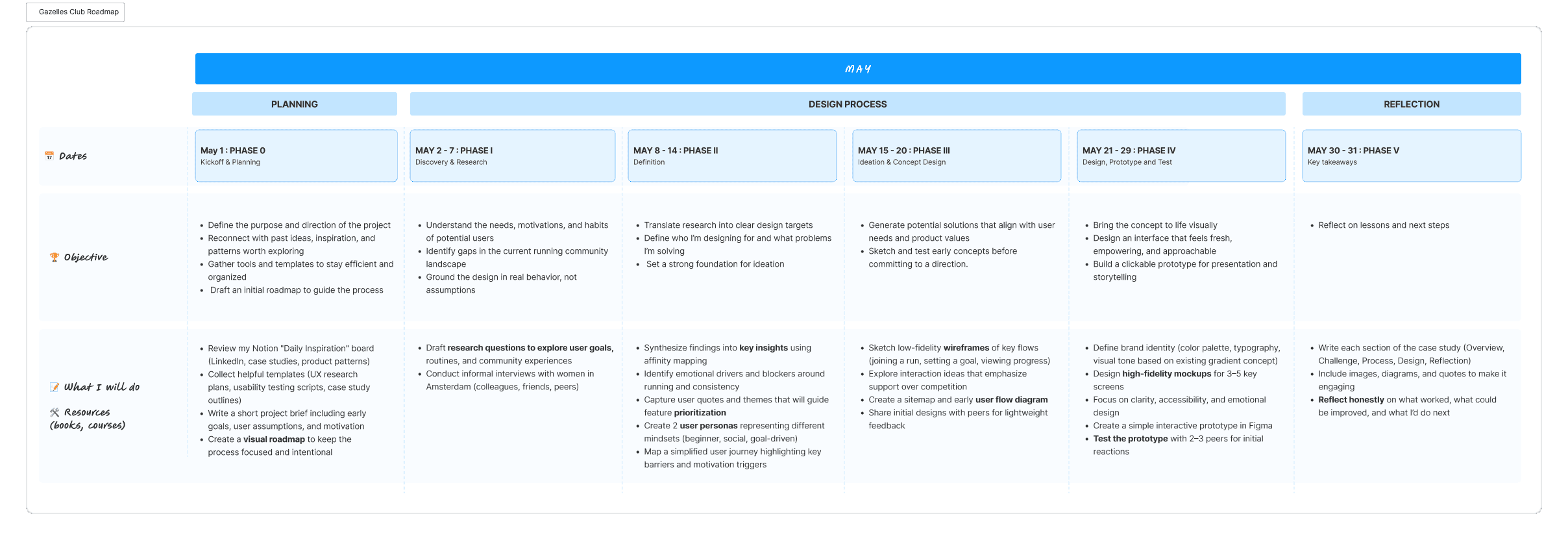 As a solo designer, I created a roadmap to guide research, ideation, and prototyping throughout the project.